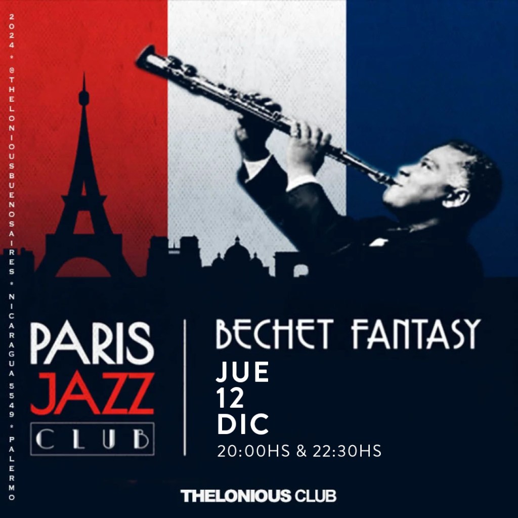 Paris Jazz Club presenta Bechet Fantasy. Los mismos creadores de “Woody Allen Night” y “Jazz Cartoons” con más de ochocientas presentaciones en vivo, convocan a un espectáculo en donde se recreará la atmósfera del jazz que Sidney Bechet supo Llevar a París desde New Orleans alrededor de 1930 en barco, puesto que aún la tecnología de aviones no era lo suficientemente segura. El compositor, clarinetista y saxofonista Sidney Bechet, nacido en New Orleans, ha sido un gran referente musical en las bandas sonoras de Woody Allen como la tan reconocida apertura de Medianoche en París.